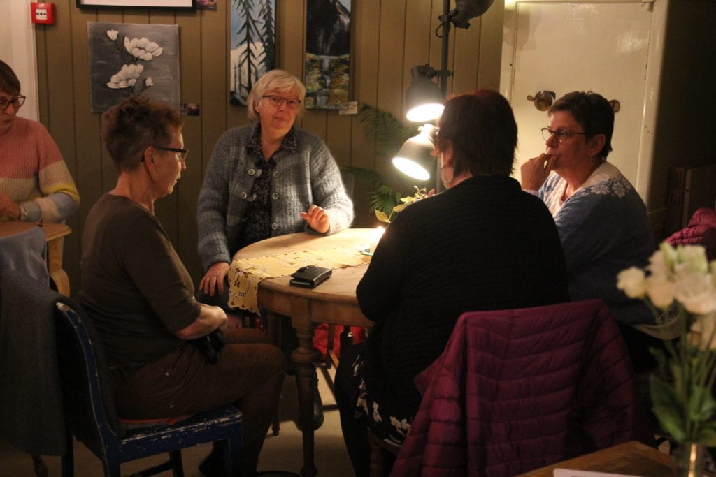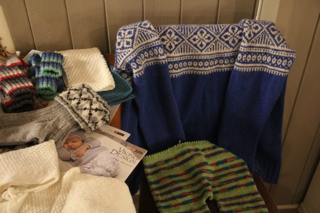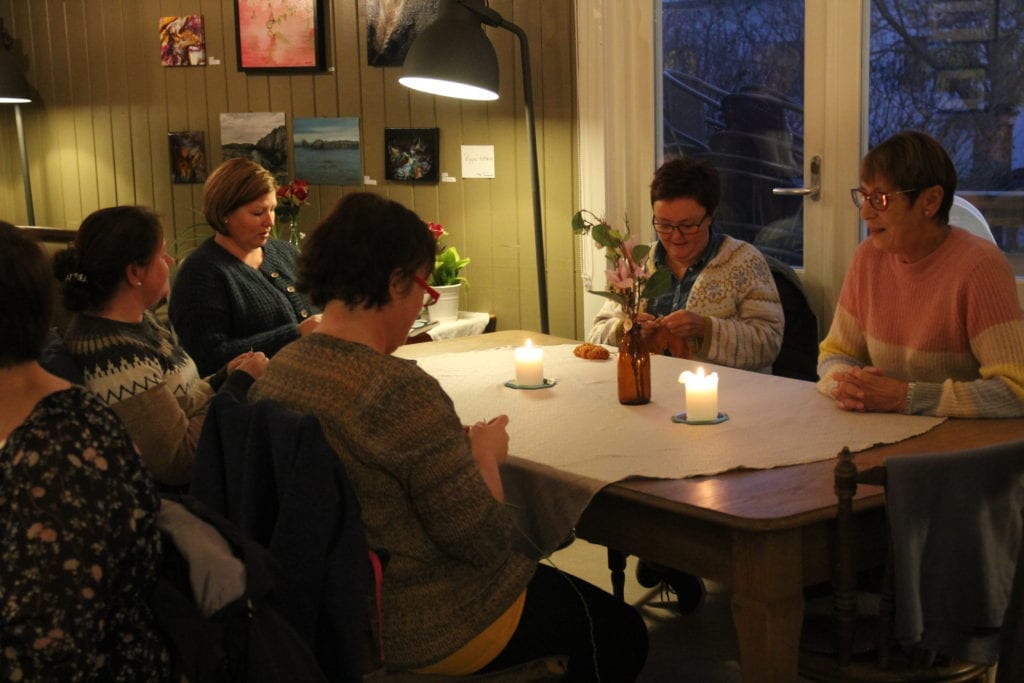 – Vi har 10 års-jubileum i år, det hadde jeg ikke tenkt. Jeg trodde det var neste år jeg. Det må vi jo markere, smiler Bjørg Fuglebrenden mens hun legger fram noen av tingene som har blitt produsert i løpet av de ti årene strikkekaféen har vært i drift. Flere av damene som renner inn døra har på seg hjemmestrikkede kofter i flotte mønstre. De finner fram pinnene og praten går lett. Ingen tvil om at de setter prise på å møtes for å strikke, og skravle da, selvfølgelig.