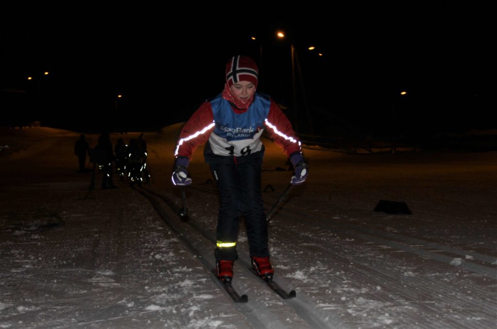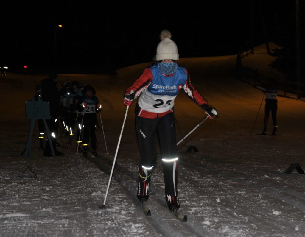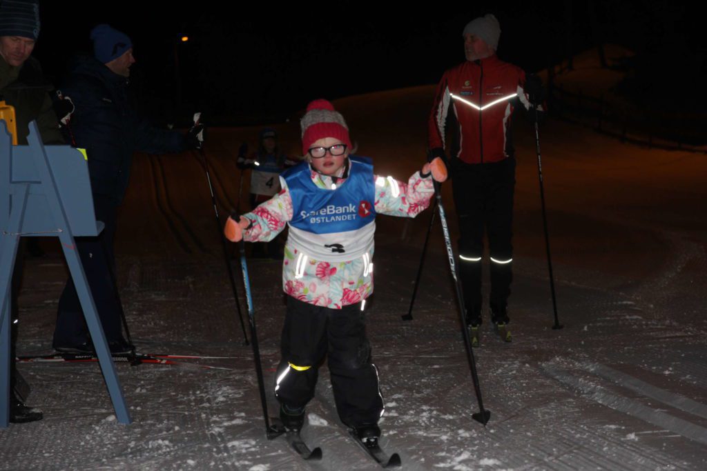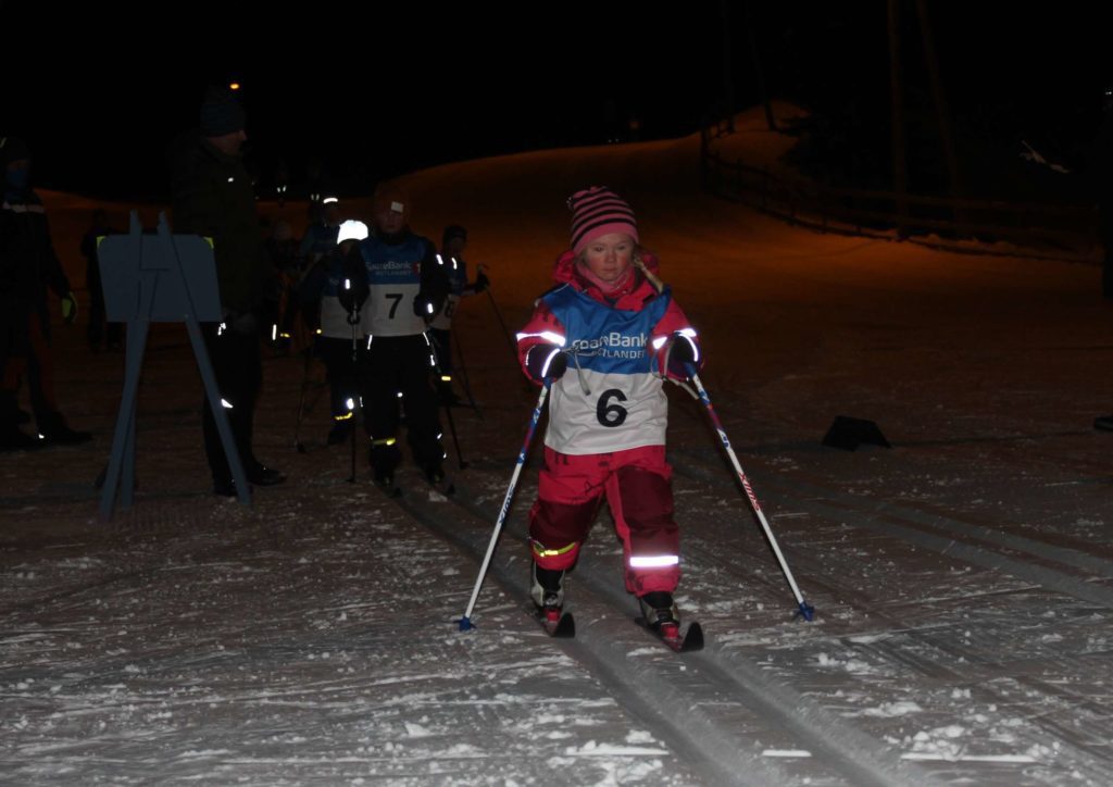 På klubbrenn starter man etter alder. Det vil si klassen 7 år og yngre først og senior til slutt. Startnummer 2 gikk sitt første skirenn og så ut til å kose seg i kulda. Monica Cae var ganske ensom i seniorklassen og hun sier nok ikke nei takk til noen konkurrenter neste gang, men glad det var hun også.