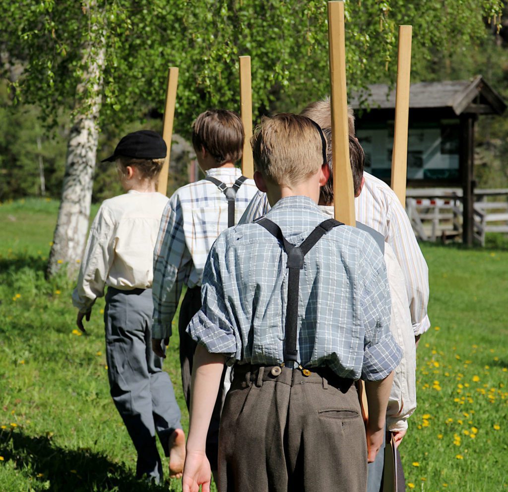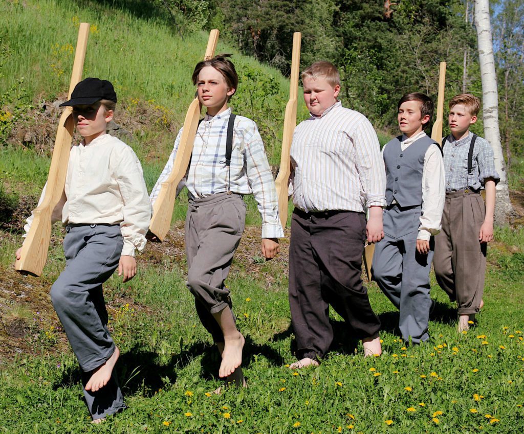 Guttene marsjerer og synger «gymnastikk og eksersis, ja det er på sett og vis fundamentet i vårt forsvarsverk» og marsjerer bortover med våpenet på aksla. De er i god gang med øving til årets oppsetning av syngespillet om 12-årige Edvard sin sommerferie på Ådalsbruk i 1875.