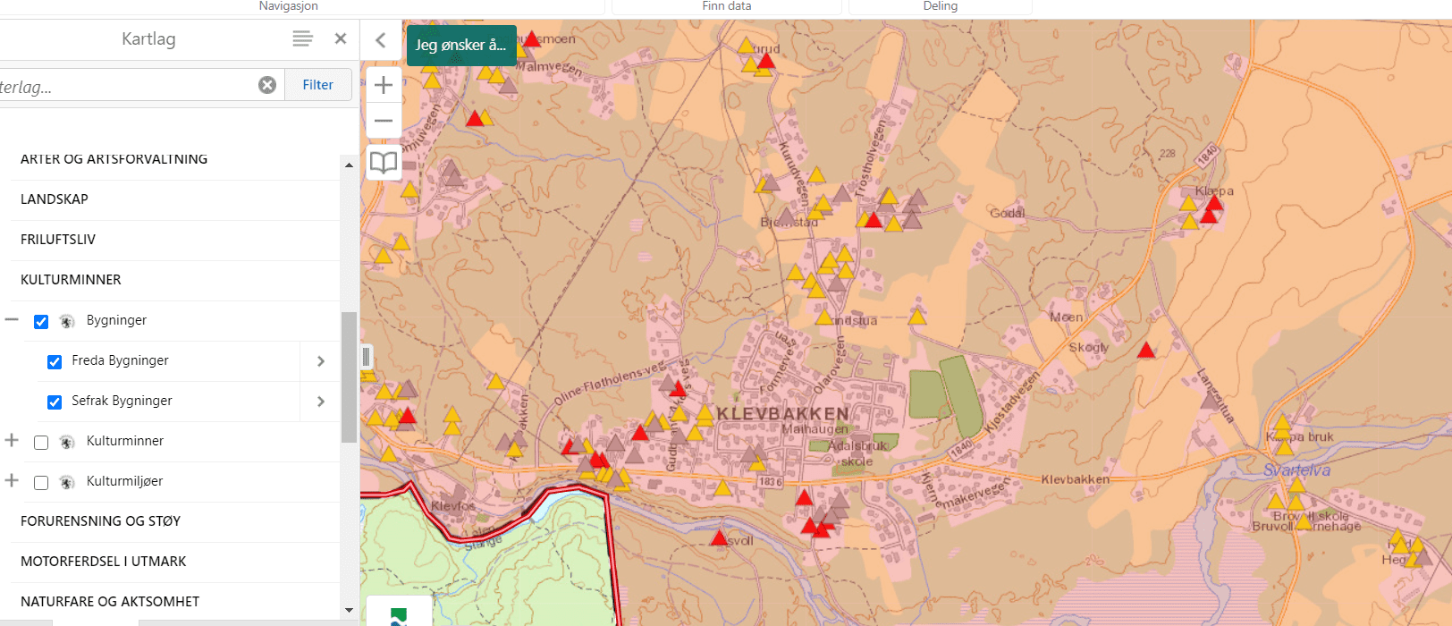 Er du interessert i kulturminner er dette kartet ei gavepakke. Velg «Kulturminner» og deretter «Bygninger». Ved første øyekast kan det se ut som det ikke skjer noe med kartet, men zoomer du inn vil det dukke opp gule og røde trekanter over hele kartet. For eksempel kan man se at mølla på Klæpa bruk er fra 1800-tallet tredje kvartal. Opptegnelsene er fra SEFRAK, altså Sekretariatet for registrering av faste kulturminner i Noreg, utført av Riksantikvaren mellom 1975 og 1995.