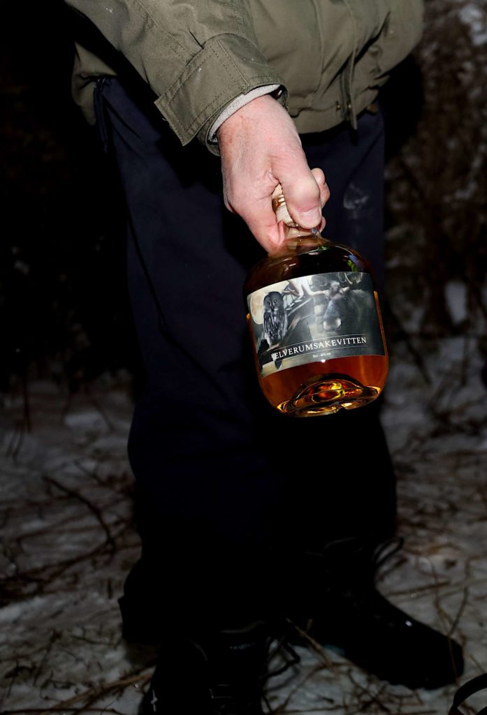 Tilbake på Veensjordet står Skaaden og forteller om Elverumsakevitten, dagens utvalgte. Den har etikket tegnet av lokal kunstner fra Elverum og epler fra Egge gård.