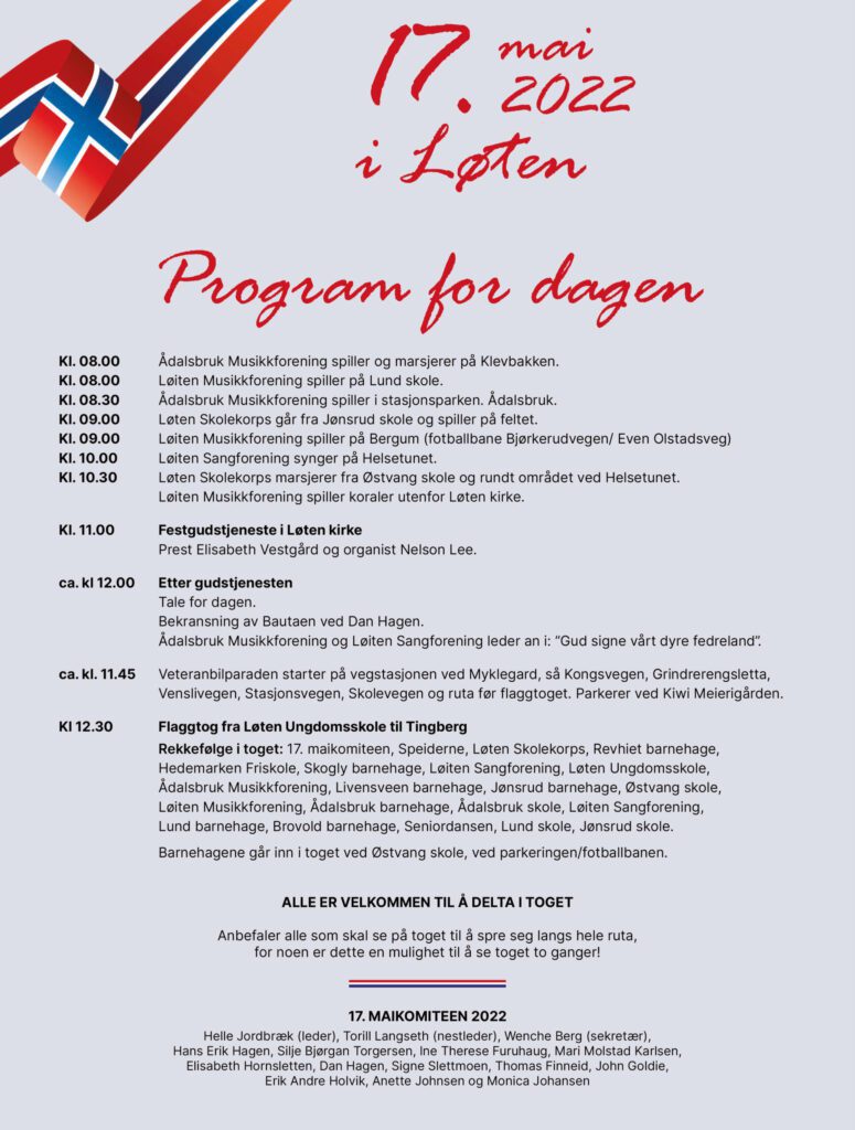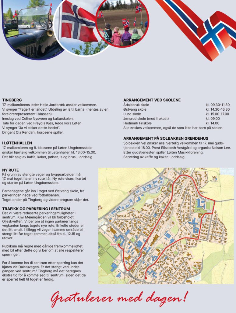 Program 17. mai i Løten TOG MED NY RUTE: På grunn av veiarbeid blir årets flaggrute annerledes enn før. Kart for årets rute finnes på Løten Kommune og i mittLØTEN. FOTO: Løten Kommune Line Larsenline@mittloten.noPublisert: 12. mai 2022 kl. 12:47 Obs! Artikkelen er mer enn ett år gammel. Del på Facebook Del på X Saken fortsetter etter annonsen Du vil kanskje også lese Ingen relaterte artikler.