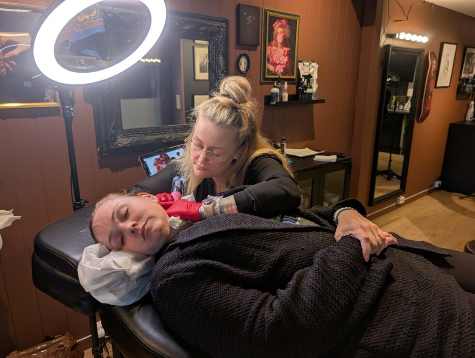 Da vi er innom er det Anette Linden fra Hadeland, som har lagt seg til rette i tatoveringsstolen. Hun får dekket over en gammel tatovering fra 20 år tilbake.