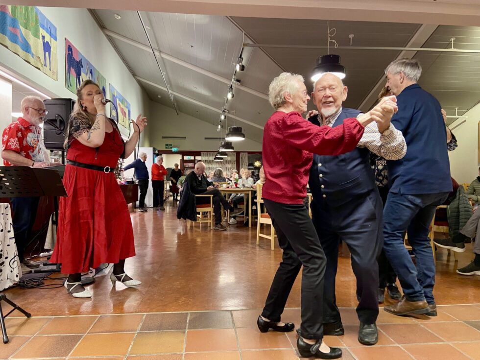 De fleste frammøtte nøyer seg likevel med å se på, nyte den gode stemningen og kanskje vippe med foten i takt med musikken. Så blir det pause, og kaffen kommer på bordet, sammen med kaker og utlodning.