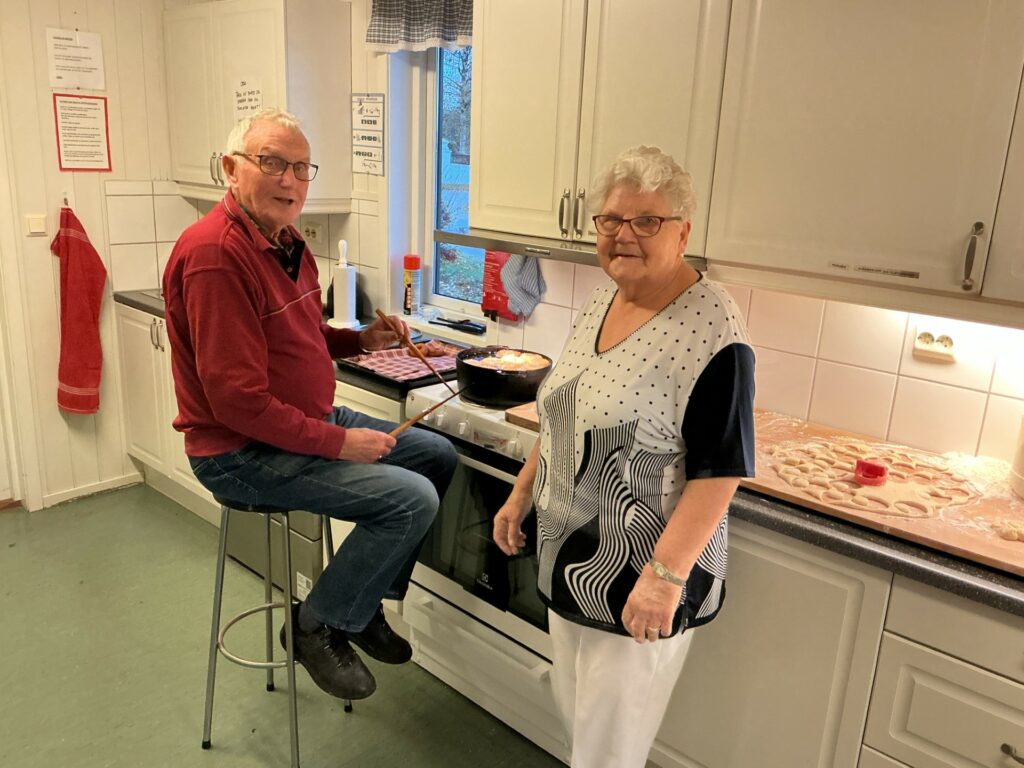 Her er Eldbjørg Amundsen i gang med smultringer, godt hjulpet av samboer Odd. Foto: Privat