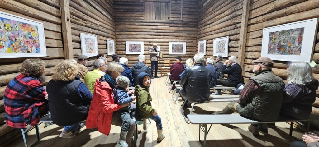 Fram til søndag 28. september kan du oppleve en helt spesiell utstilling i Løten. Kunstneren Tore Solberg, som nylig fylte 90 år, viser fram sine arbeider i blandede teknikker og tresnitt – og sto selv for det musikalske innslaget under åpningen.