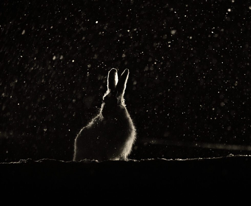 HARE I SNØFALL: Runar Nikolaisen har laget en fôringsplass med kunstig lys for å ta bilder i mørket. Her har en hare dukket opp. Alle foto: Runar Nikolaisen
