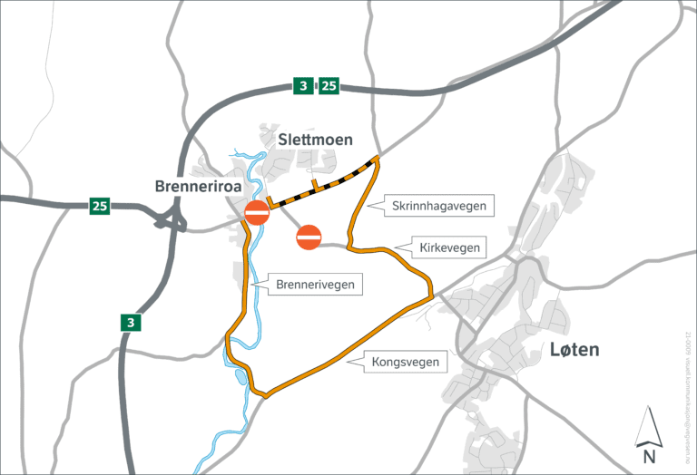 Onsdag stenger Chausseen og Kirkevegen i Prestegårdskrysset for bytte av bru og ombygging av kryss. Her kan du se omkjøringsruta