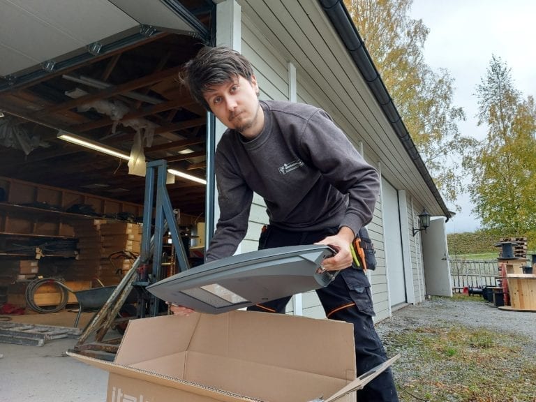 Fredrik bytter ut armatur på lyktestolper i Løten slik at du skal få bedre lys langs vegen